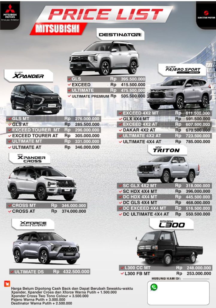 Perkenalkan saya selaku (Konsultan Penjualan) dari Dealer Resmi Mitsubishi Kediri – PT Sun Star Motor. Di bawah ini tersedia daftar harga mobil Mitsubishi di Kediri yang dapat Anda periksa terlebih dahulu.